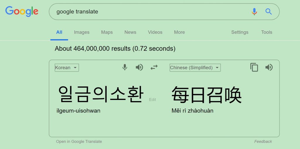 - 第二,在东方墙壁上有一句韩问일금의소환。当你用谷歌翻译(google translate) 就是 《每日召唤》 !当下一惊,知道大事不妙,玄学上就是每日召唤老虎下山,每日召唤病痛。(请看下图)