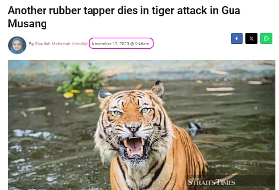 - It is very rare for a Malayan tiger to kill 3 humans within 1 month(as reported below) 老虎發兇