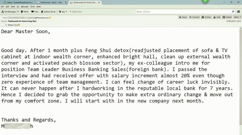 您好。经过一个多月的风水排毒(室内家具、电视柜等的从组,室内财位布局,加大室内采光,整合室外财位,同步催旺贵人方位等)之后, 我的同事(贵人) 介绍我前往一家海外银行面试 “商业银行业务销售团队领导” 一职。虽然我本身对该职位所要求的团队管理经验近乎“零” ; 然而我却奇迹般的顺利通过该面试而成功的获得以额外20%的薪金提升受雇录取。我可以感到我事业运的具体和明显的转变。这从未在我艰辛而努力服务了7年之著名本地银行时期发生。所以,我毅然的决定把握这难得一遇的机会,立志迎接特别的挑战,勇敢的跳出过去的舒适区. 我将于6月在新的银行机构展开新旅程。