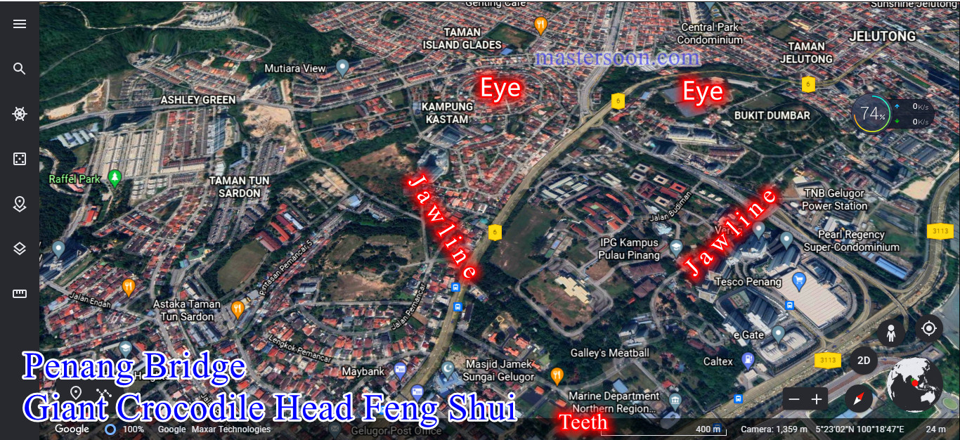- However, from a feng shui perspective, there is Gigantic Crocodile Head Formation(Hill) right behind e-Gate, Caltex & Tesco Penang on your left when you are coming down from the Penang Bridge & heading to George Town.
