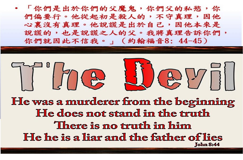 - 44 You belong to your father, the devil, and you want to carry out your father’s desires. He was a murderer from the beginning, not holding to the truth, for there is no truth in him. 你 們 是 出 於 你 們 的 父 魔 鬼 , 你 們 父 的 私 慾 你 們 偏 要 行 。 他 從 起 初 是 殺 人 的 , 不 守 真 理 , 因 他 心 裡 沒 有 真 理 。 他 說 謊 是 出 於 自 己 ; 因 他 本 來 是 說 謊 的 , 也 是 說 謊 之 人 的 父 。